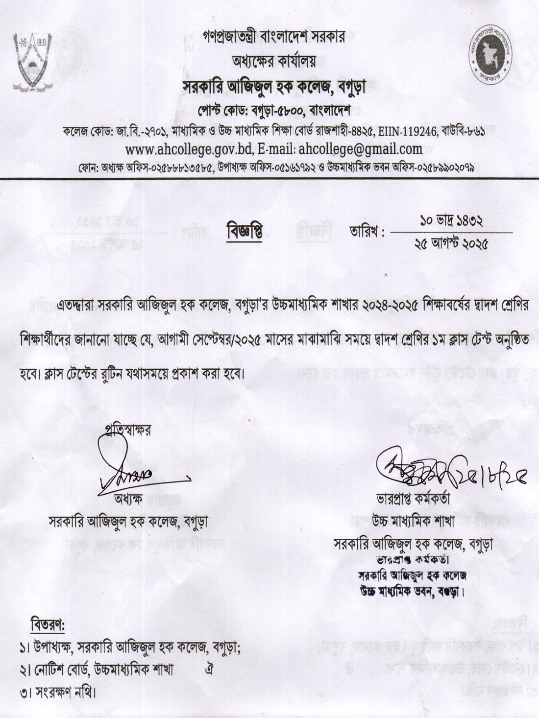 | 64 | 25 Aug, 2025 | ২০২৪-২০২৫ শিক্ষাবর্ষের দ্বাদশ শ্রেণির শিক্ষার্থীদের ১ম ক্লাস টেস্ট সংক্রান্ত বিজ্ঞপ্তি | View Download |